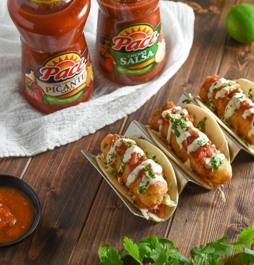 Top with your favorite taco toppings and a tangy blend of salsa mixed with tartar sauce. Layer with pico de gallo, pickled veggies, crispy fish sticks, vegan tartar sauce. In a small bowl, mix together mayonnaise, sweet pickle relish, and minced onion. In your corn or flour tortillas add the baked fish sticks. In a large, deep skillet, heat the oil to 350°.